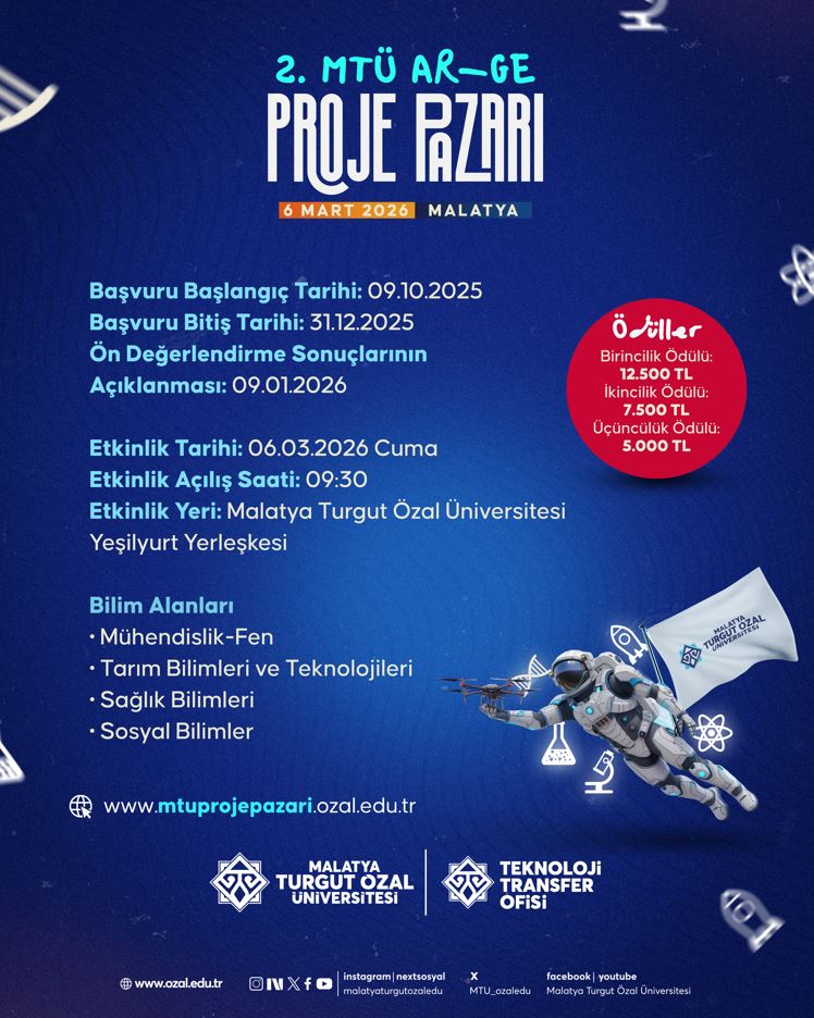 Malatya Turgut Özal Üniversitesi tarafından düzenlenen “II. MTÜ Ar-Ge Proje Pazarı 2026” etkinliği, yenilikçi fikirleriyle geleceğe yön vermek isteyen öğrencileri, akademisyenleri ve sanayicileri bir araya getiriyor. Bu yıl ikinci kez düzenlenecek olan Ar-Ge Proje Pazarı, Malatya Turgut Özal Üniversitesi ve İnönü Üniversitesi bünyesinde öğrenim gören ön lisans, lisans ve lisansüstü öğrencilerin Ar-Ge ve inovasyon temelli proje fikirlerini sergilemelerine olanak tanıyacaktır.