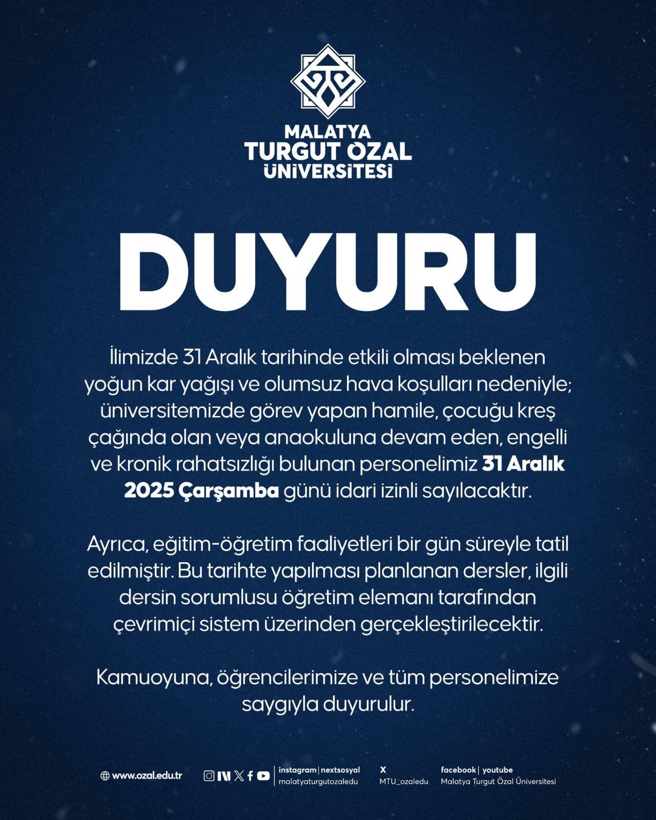 İlimizde 31 Aralık 2025 tarihinde etkili olması beklenen yoğun kar yağışı ve olumsuz hava koşulları nedeniyle, Malatya Turgut Özal Üniversitesi tarafından alınan karar doğrultusunda eğitim-öğretim faaliyetlerine bir (1) gün süreyle ara verilmiştir.