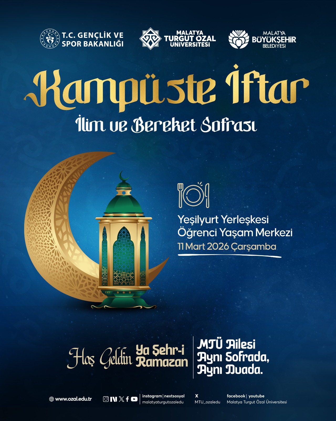 Malatya Turgut Özal Üniversitesi ailesi olarak Ramazan ayının birlik, paylaşma ve bereket atmosferini hep birlikte yaşamak üzere düzenlenen “Kampüste İftar – İlim ve Bereket Sofrası” programına tüm öğrencilerimiz davetlidir.