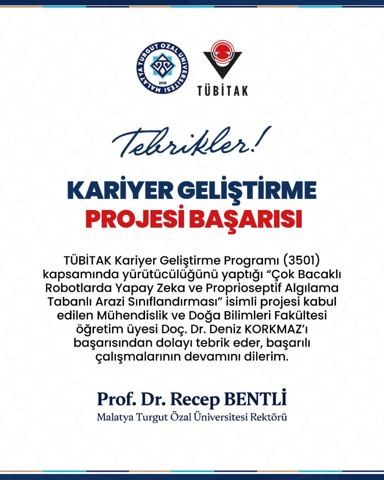 TÜBİTAK Kariyer Geliştirme Programı (3501) kapsamında yürütücülüğünü yaptığı " Çok Bacaklı Robotlarda Yapay ...