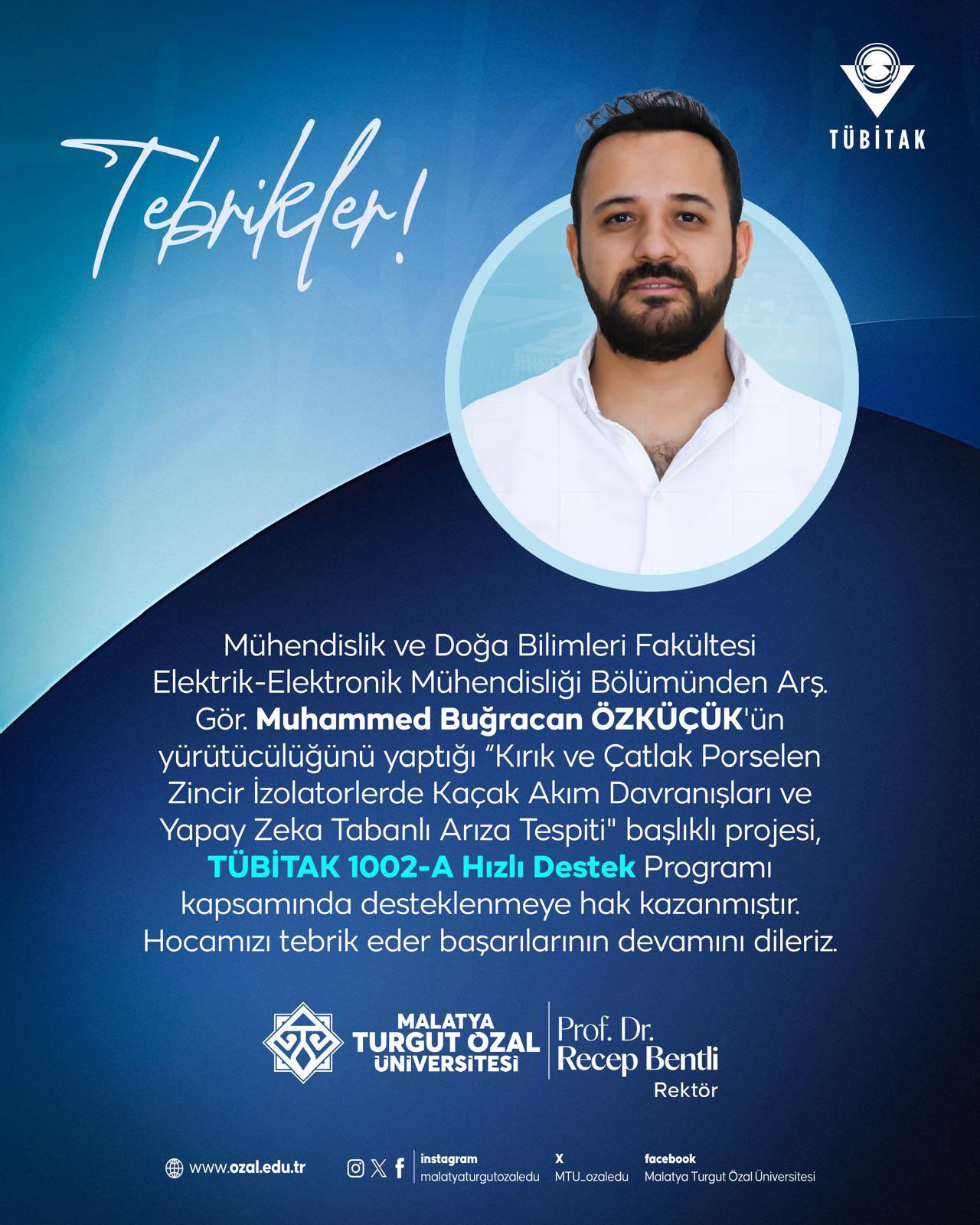 Bölümümüz araştırma görevlilerinden Arş. Gör. Muhammed Buğracan ÖZKÜÇÜK’ün yürütücülüğünü üstlendiği "Kırık ve Çatlak Porselen Zincir İzolatörlerde Kaçak Akım Davranışları ve Yapay Zekâ Tabanlı Arıza Tespiti" başlıklı proje, TÜBİTAK 1002 - Hızlı Destek Programı kapsamında desteklenmeye hak kazanmıştır.