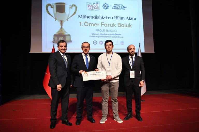 Bölümümüz Öğretim Üyesi Doç. Dr. Gürkan KAVURAN'ın danışmanlığını yaptığı, öğrencimiz Ömer Faruk BOLUK'un yer aldığı "Otonom Mobil Araçlarda Şeritte Kalma Algoritmalarının Geliştirilmesi" isimli proje Mühendislik ve Fen Bilim Alanında Birincilik ödülü almıştır. Öğretim üyemizi ve öğrencimizi tebrik eder başarılarının devamını dileriz.